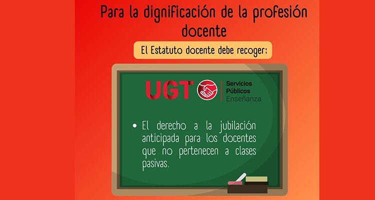 UGT exige, junto a la continuación y prolongación de la jubilación voluntaria LOE, introducir en el ámbito del funcionariado docente la jubilación anticipada, a la que se pueda acoger también el profesorado perteneciente al Régimen General de la Seguridad Social.