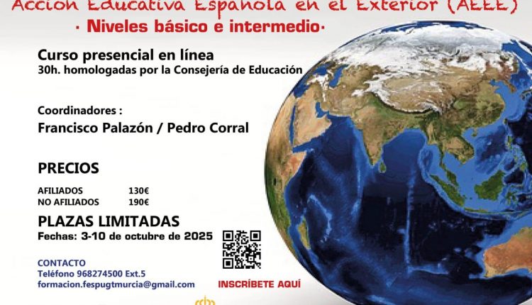 La Federación de Servicios Públicos de Murcia ha convocado un curso denominado la Acción Educativa Española en el Exterior (AEEE). Es un curso de 30 horas, en modalidad presencial en línea y está homologado por la Consejería de Educación de Murcia.
