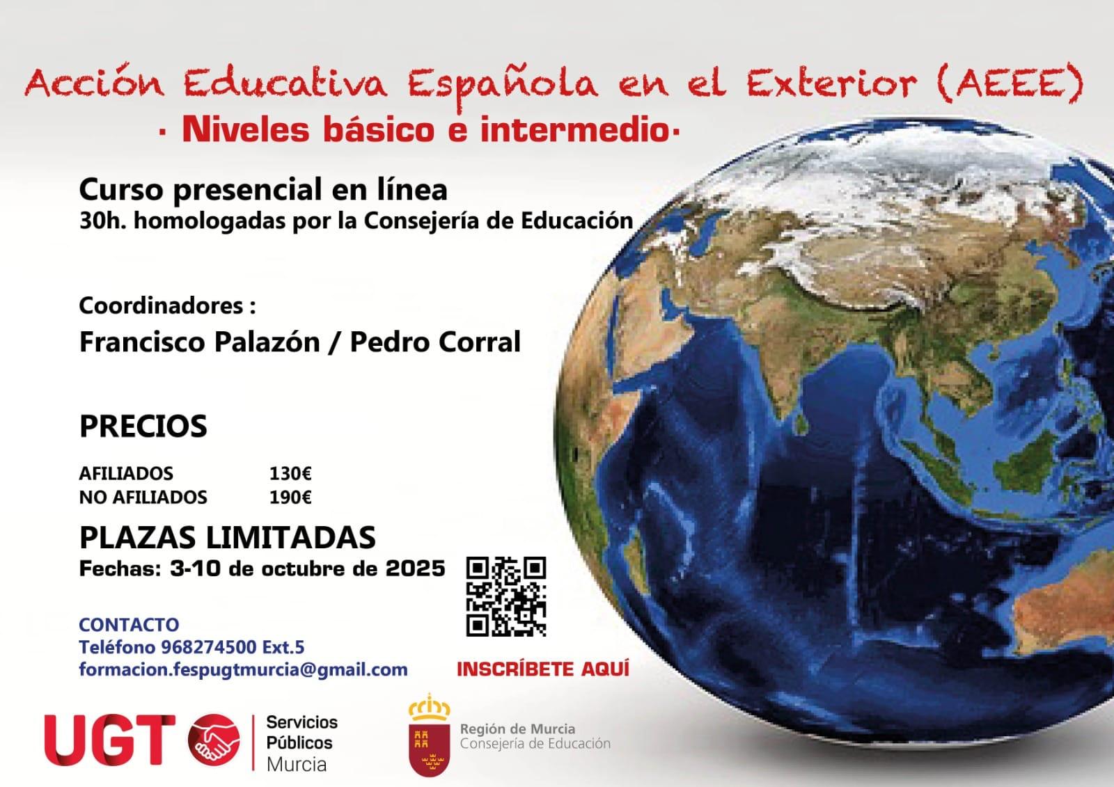 La Federación de Servicios Públicos de Murcia ha convocado un curso denominado la Acción Educativa Española en el Exterior (AEEE). Es un curso de 30 horas, en modalidad presencial en línea y está homologado por la Consejería de Educación de Murcia.