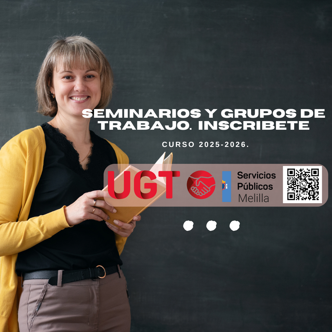 Desde la Sección de Enseñanza de UGT Servicios Públicos de Melilla queremos animar a todo el profesorado a participar activamente en la convocatoria para la constitución de Seminarios y Grupos de Trabajo en centros docentes de Melilla, dentro de las modalidades de formación permanente del profesorado. Esta oportunidad formativa resulta especialmente relevante para el profesorado que quiera participar tanto en los concursos de traslados como en las convocatorias de oposiciones a funcionario de carrera en los cuerpos docentes.